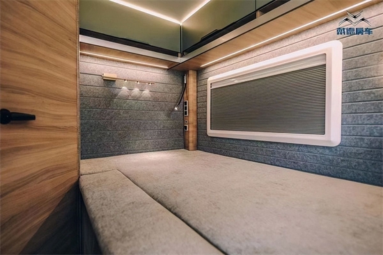尾部纵床的设计,可拓展,尺寸为:2000*1200mm。床铺的侧边整体软包触及皮肤更加温和的同时还设计超大尺寸的外推窗,方便观赏风景的同时也可以做到采光和透气的作用,整车的储物空间也是非常宽裕,顶部一排吊柜,床下大面积储物空间,2-3人出行的行李物品完全可以放下。