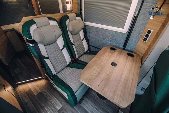 驾驶室往后是车内会客区的位置,高配版车型奢侈地设置了两个航空座椅,带通风、加热、记忆、按摩、电动脚托等多项功能,舒适度绝对是一流的。座椅侧面就是前面提到的开放式车舱,行车时小窗观景,露营时直接上大窗,要的就是惬意的感觉。座椅上方配有一台1.5P的FUJISHU变频空调。