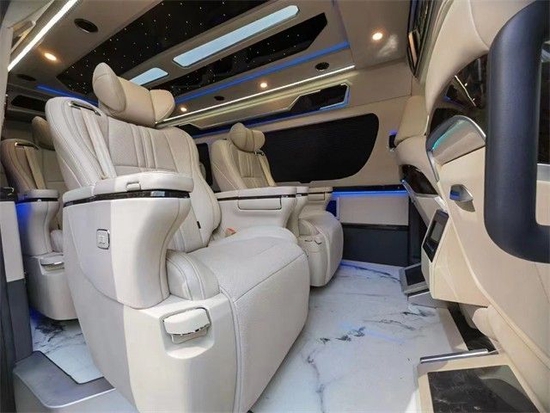 整车升级了加强型的隔音隔热处理,车内带空气净化系统,无线充电系统。在进门侧加装了氧化铝脚踏带迎宾灯的,整车都是采用纳帕级皮质进行包覆的,侧壁桃木装饰,手动百褶窗帘,后舱暖风系统,还配有智能触摸控制系统。让您进入车内犹如走进奢华的殿堂。