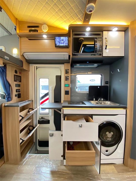 厨房区域配有电磁炉、带盖水槽、抽油烟机、微波炉等。其下方橱柜内配备一款小天鹅3kg洗衣机。同时电路方面本车搭载了3000W充逆变一体机+100AH的铅酸电池,可保障日常2-3天的生活用电。同时也能让我们在车内体验烹饪的快乐。