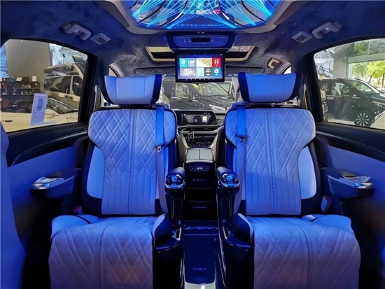 中排航空头等舱座椅舒适性MAX,通风加热按摩旋转应有尽有。顶部采用麂皮绒包覆加星空顶设计,加上车内大量氛围灯的点缀,车内氛围非常舒适。地板使用的是亚克力高光镜面地板,非常漂亮而且有着易打理的特点。(内饰风格颜色等也可以选装定制)