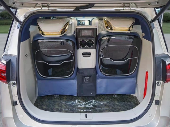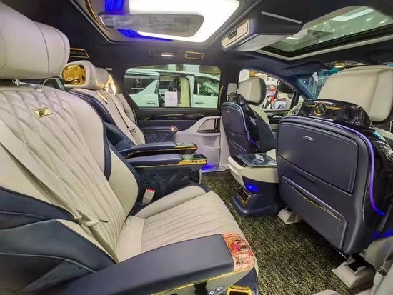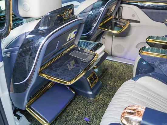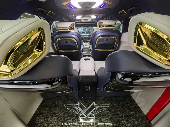 仪式感一直都是从细节开始积累,双侧的电中门一键开启。进入到后舱更是给人耳目一新的感觉,铝合金迎宾踏板,头顶“盛唐国风”云中石顶灯,以及氛围灯体现克慕勒的奢华设计风格!黄金元素的金边点缀正如克慕勒的定位:只为更高端。