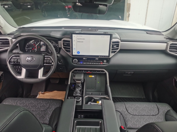 丰田坦途的内饰设计也采用了新设计风格,“硬”还是第一感受。无论是平直的线条还是灰白的用料配色,车内的风格都是非常偏向于越野,宽大的悬浮式液晶中控屏幕也是挺抢眼的,根据不同配置也将提供有8英寸以及14英寸的不同配置,就是这个感觉还是很像“大彩电”,只是放在这台车上会显得更协调一些,功能上也丰富了在线车联网以及CarPlay车机互联功能。