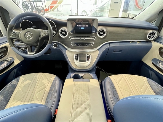 内部设计亮点更多,以深蓝和米白作为主色调,点缀有实木和黑色,商务气息十分浓厚,主驾驶座椅根据人体工学进行设计,能够完美贴合乘坐时的曲线,缓解长时间驾驶带来的疲惫。车内采用原装V级方向盘,功能布局也基本沿用原车布局,主要材质为桃木和真皮拼接而成,触感舒适丝滑,中控台保留原有的8.1寸全覆式大屏,采用了贯穿式桃木套件包覆,搭载有隐藏式氛围灯,营造出浪漫温馨的氛围。