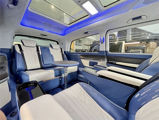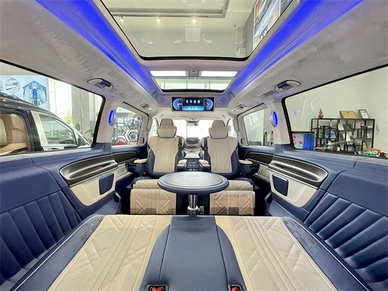 二排座椅采用乘客级别座椅,侧面有电动调节按钮,可以随心调节至舒适角度,三排座椅采用三联式设计,可以放倒作为临时休息使用。将第二排座椅旋转后与后排座椅形成对坐式格局,方便进行商务会谈或是处理工作,车内随时变身第二个移动的办公室。二排座椅中间设置有一个中控台,可以与顶部的28寸智能电视相连接,丰富乘坐体验,选择喜爱的电视节目和音乐打发行车时光。