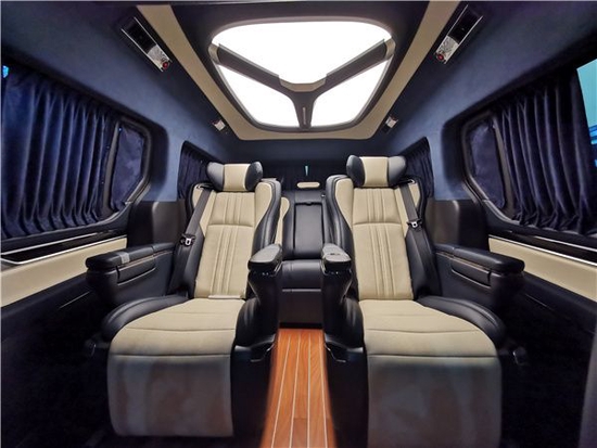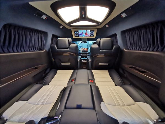 时尚内饰装饰,隐私布艺窗帘,采用高级皮革+麂皮绒包覆车壁,奢华的LED天幕顶灯,车载互联网电视,保真音响,支持私人定制和选配升级改装。
