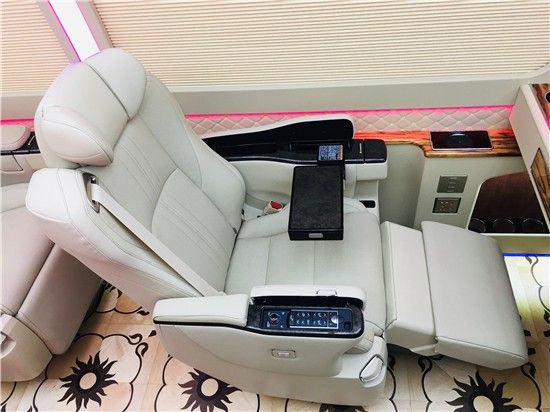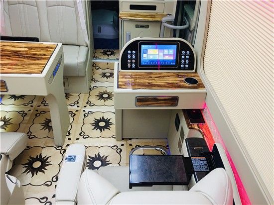 丰田考斯特改装商务车在车内娱乐方面实属下了很大的手笔,整车的一体式多媒体影视系统,配备上高清32寸三星显示器和蓝光DVD主机,全车构建5.1声道HI-END高保真环绕音响系统,12个喇叭,3块功放,1个12寸超重低音,旨在尽可能还原真实音场,丰田考斯特改装车在窗帘的设计上为客户提供了两种选择,一种是优雅的布艺窗帘,另一类是百褶窗帘,布艺窗帘简单实用,百褶窗帘尊大气,遮光性更好,更可选装电动装置。