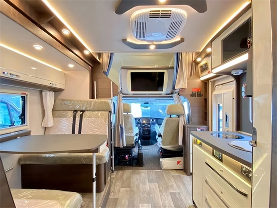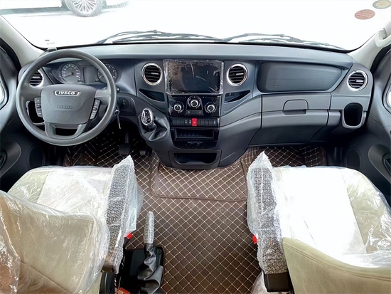 车身内饰经过精心的设计,无论质感还是观感都有所突破,以咖啡色与白色搭配营造氛围,木质纹理与白色烤漆相间呼应,用料做工及配色方案无不突出高端二字。驾驶室上方额头双人床的设计,尺寸为2200×1500(mm),通过室内爬梯可上下往返,还是比较便利的。