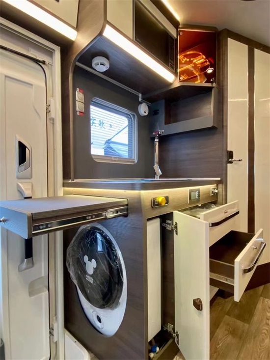 厨房区位于进门处左手边,集成了志高1200W的220V电磁炉、带盖式不锈钢洗手池、1500W美的微波炉、操作台下方韩国进口大宇洗衣机2.5公斤及城邦房车专用侧出抽油烟机等设备,不耽误您烹饪美食大餐。