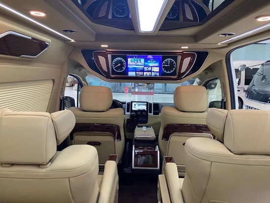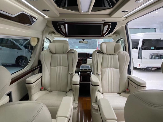 丰田海狮9座内饰配置:DVD智能24寸显示器、卡拉OK系统、折叠桌、导航、倒车影像、仪表实木内饰、主副驾驶真皮、主副司机实木内饰、内饰把手实木、空调出风口实木、全皮软包内饰顶棚、两侧航空灯、两侧窗帘、两侧装饰框及中门尾门、全新设计艺术办公桌(纸巾盒、杯架、抽屉)、220V电源、四张埃尔法 (配置|询价)样式航空座椅电动前后、电动靠背、脚托、加热、按摩、通风、模具塑料真皮扶手(镶嵌实木装饰)、三人连体加宽加大加厚沙发、艺术定制地板、两侧饰板软包、车内两侧饰板加装隔音隔热棉及止震垫等等…