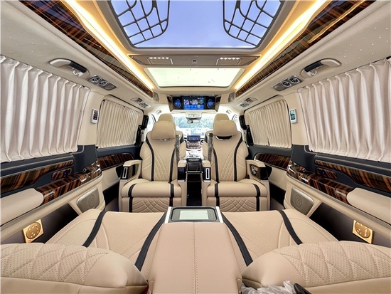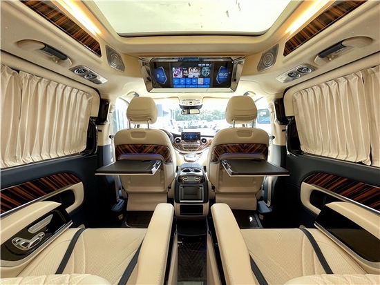 第二排座椅安装进口首席航空座椅,加热通风按摩功能齐全,最大限度减缓您的乘车疲惫。奔驰V260L改装商务车无高顶无隔断简单改装八向电动调节:电动头枕,电动腿托,前后电动调节,电动靠背调节。奔驰V260L改装 每一席座椅皆享尊贵定制级的豪华舒适。