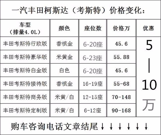 丰田考斯特能够屹立于中巴车领域而鹤立鸡群,有着其核心的影响力在里面,其实不管是什么汽车都离不开其最核心的诉求,那就是安全、环保与节能。丰田柯斯达是世界公认的“豪华客车”代名词,是您商务活动中最值得信赖的忠实伙伴,那充满美感的造型和优良的性能,深受世界各地用户的喜欢。购车咨询电话:13901036576 魏经理 同微信