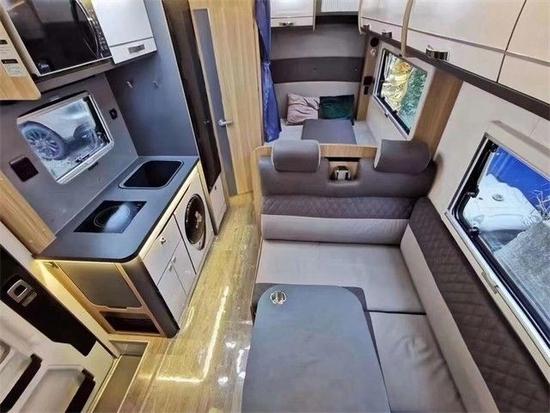 会客区采用了L型卡座+可升降式餐桌的搭配,可供多人休闲娱乐使用,可以临时组合成床,增加了内部睡眠空间,会客区上方搭载了多组储物吊柜,满足储物需求。