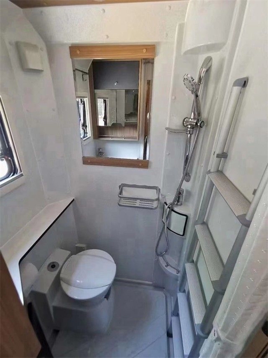 卫生间内部安装有马桶、淋浴系统、洗手池、储物台、镜子、换气扇等配置。满足您的沐浴需求绝得没问题,同事该车配备了220L的超大净水箱,60L灰水箱。