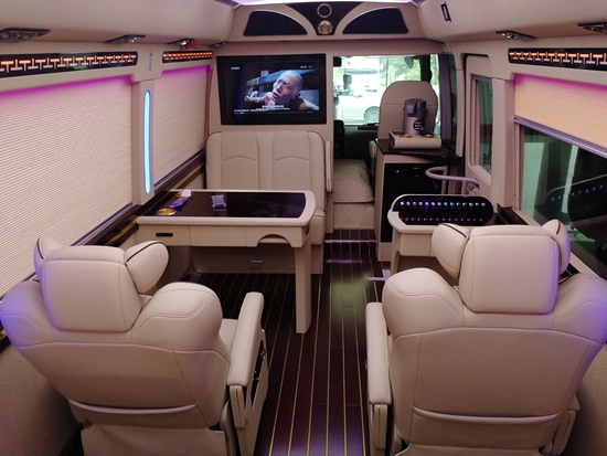 改装是为了更加美观更加舒适或者更能彰显一种尊贵的身份。丰田考斯特在内饰的改装上更加注重尊贵的衬托,高档的豪华座椅暂且不说,自动调节的百叶窗帘也无需再提,就拿车载的影音系统来说,我们完全可以依靠自己的需要设计符合我们需要的车载影音系统,高清的显示屏,专用的麦克以及高级的扬声器设备,随时随地带给乘车人员一种舒适的享受。