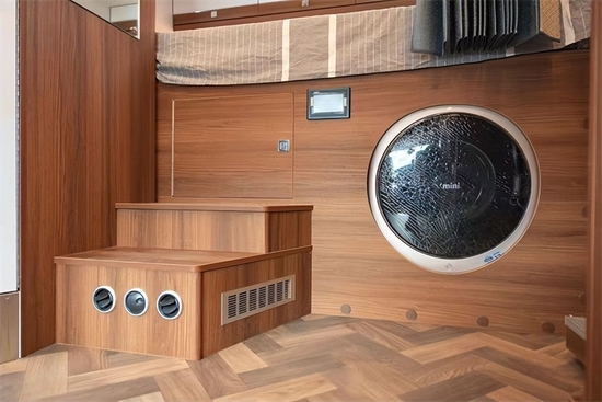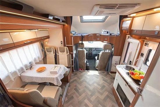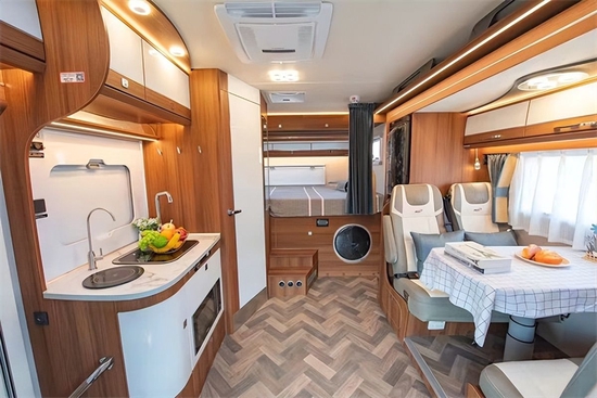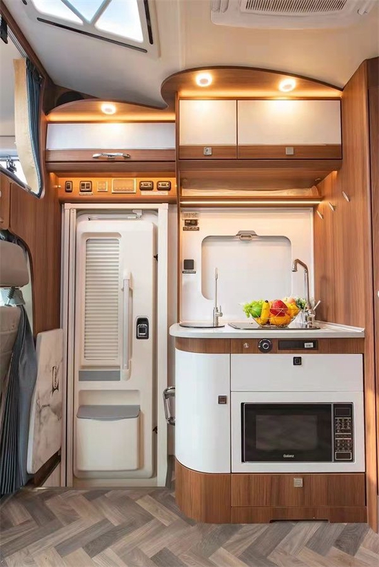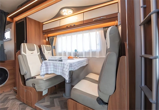 后方分别是会客区、厨房区、卫生间和后置床的布局,拓展下的空间更充裕一些,驻车时车内也有更多活动空间。会客区域四人对卡座设计,配有滑动插座,采用仿布艺超纤皮人体工程学乘用车可调节座椅,乘坐更为舒适安全,搭配多级多向可调节餐桌(带笔记本收纳),上方是一组吊柜,配有暖黄色氛围灯,照明的同时提升氛围感。