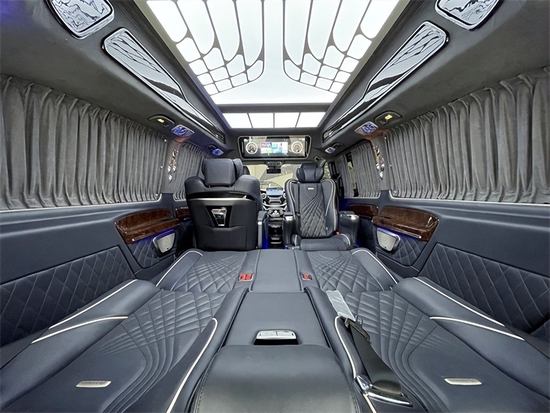 全新奔驰威霆2+2+3座椅陈列,最主要的内饰就是座椅。在改装后奔驰奔驰威霆车顶设计上也富有层次感,灯光采用碎钻搭配,使整车内部空间氛围温馨且大气,而且在造型上也是亮点突出,三款时钟搭配,无时无刻都在彰显奔驰威霆改装商务车高顶版的豪华非凡