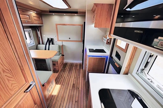 车位里有一张卧式的母子床,上铺2400mm 730mm,下铺2050mm 1000mm,整体可以睡三个人,再加上客厅的两个人,整车其实可以是同时满足五个人的休息需求的。床还配有照明、电源插座、复古窗和顶部天窗。下铺比上铺短350mm,主要是因为在横床内侧提供了一套复古的双层储物柜搁板,满足用户存放衣物的需求。房车的整个右侧设计为车内厨房区,但是被房车的中间门隔开了,做饭和洗漱是分开的。橱窗左侧是152升进口Sedford房车冰箱、微波炉、西门子电磁炉、调料存放区、进口房车抽油烟机、折叠菜板、多层橱柜等。右侧厨房主要配备三个功能:洗菜槽和上下储物柜,洗碗洗菜更方便,还可以收纳更多的物品,最下面还有一个3KG的大宇滚筒洗衣机。