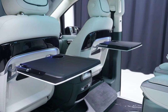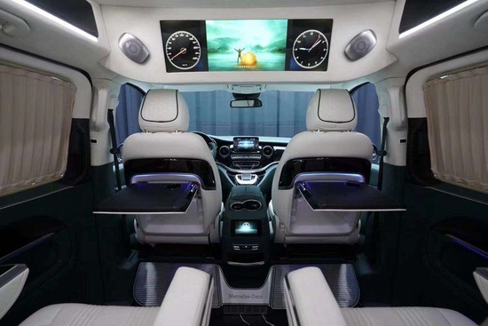 奔驰v250的后面乘客舱,两个航空头等舱座椅,运用了大量的菱形缝线,功能上依然是加热通风、电调、以及座椅按摩功能等全部具备,改装后,奔驰v250还是想要突出商务车温馨、舒适、家用这些特点。包括奔驰v250的座椅也是重新包覆,人体工程学设计很到位,腰部的包裹和腿部的承托很好,坐在这上面柔软舒适,除此之外,奔驰v250还在车内加装了商务套件,在正副驾驶座椅的后面还设计了两个办公折叠桌,打开它,可以放置笔记本电脑和文件资料,很便捷和实用。
