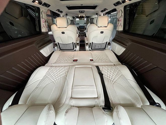 奔驰V260改装Vs680迈巴赫商务车座椅方面、推拿赐与您更温馨的乘坐感触,更有360度扭转功用; 第三排座椅打开,便可构成一张宽大温馨的沙发床,方便乘车人员休息。