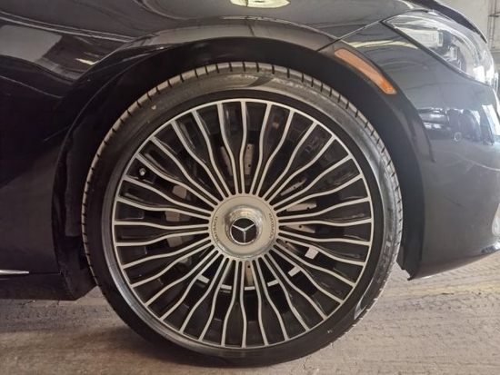 侧面部分是优雅修长的造型,车头要比尾部长很多,形成了一种拉伸的效果,通过银色饰条包边的车长和门板加持,营造出了非常商务豪华的气质。C柱部分配备的双M LOGO,则彰显了该车迈巴赫的身段。当然熟悉的双色车身没有出现,算是一个不小的遗憾。配置上,迈巴赫S580 4MATIC是搭载了R21的多辐式轮圈,少了些许商务气息,多了一些运动气质。
