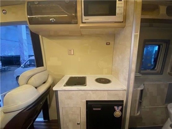 道奇公羊商务房车头等舱座椅中间留有过道,可直接进入车尾厨房及卫生间区域。一侧厨房采用L型橱柜设计,台面集成嵌入式电磁炉、升降插座台(带无线充电)。