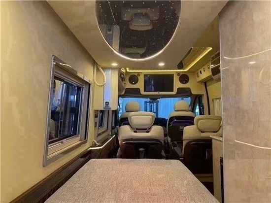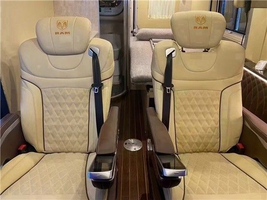 道奇公羊商务房车座舱内配有2张独立头等舱座椅,内侧可与前方隐藏式吧台座椅拼成一张尺寸为2100×550(mm)的单人床,也就是说可以满足一人睡眠需求。
