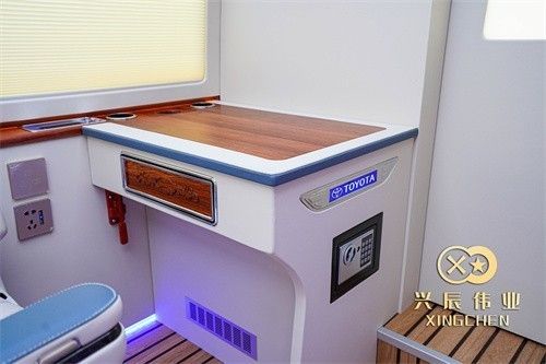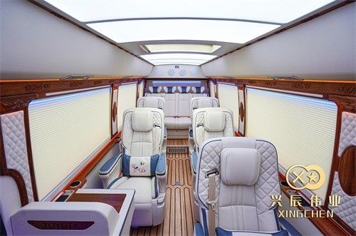 电动百褶窗帘、办公桌、保险柜、航空座椅,高端顶级橡木地板等等。顶部三色可变的氛围灯带、阅读灯、窗帘灯、立柱灯、地板灯、侧墙扶手灯、上下车方便应急灯扶手、迎宾踏板灯以及最后一排可180度放倒的电动沙发大床。一应俱全,你还想要啥,考斯特都能满足你!