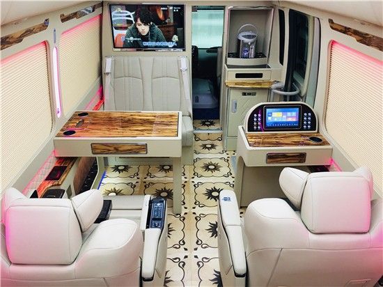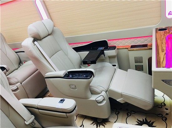 丰田考斯特改装商务车在车内娱乐方面实属下了很大的手笔,整车的一体式多媒体影视系统,配备上高清32寸三星显示器和蓝光DVD主机,全车构建5.1声道HI-END高保真环绕音响系统,12个喇叭,3块功放,1个12寸超重低音,旨在尽可能还原真实音场,丰田考斯特改装车在窗帘的设计上为客户提供了两种选择,一种是优雅的布艺窗帘,另一类是百褶窗帘,布艺窗帘简单实用,百褶窗帘尊大气,遮光性更好,更可选装电动装置。