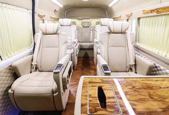 千万不要小看丰田海狮的四速变速箱!每档的切换非常平顺而且动力迅猛,高速超车觉对没压力。新丰田海狮为国五排放标准 车身重量: 2530 kg 轴距: 3860 mm 轮距(前/后): 1675/1670mm,长: 5915 mm,宽: 1950 mm,高: 2280 mm。丰田海狮HIACE车厢设计宽敞,中间走道将乘客座椅隔开,更方便乘坐及进出。所有座椅均为高级真皮并配备头枕,每个头枕及椅背均可调节至适宜高。
