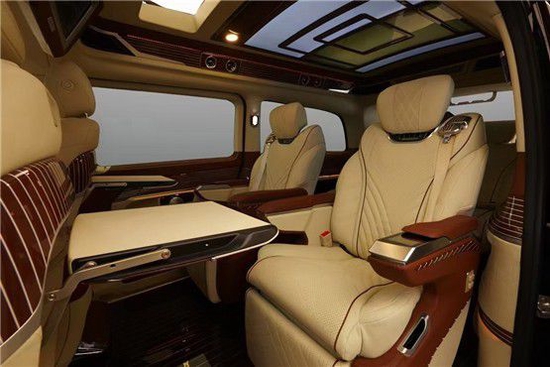 奔驰VLS600商务车整个采用米色为主色调,红为辅的配料搭配,显得高端大气。
