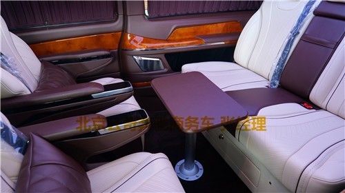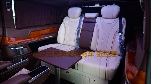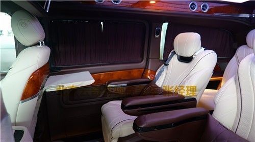 奔驰V250版以下是贵宾舱二个总裁座椅,这二个座椅具有记忆功能,何为记忆功能呢?就是一键展开及一键收回,这个座椅是根据人体工程学设计而成,能一键式找到您身体最舒适的角度。在总裁座椅双侧有两个隐藏式桌板。总裁座椅中间有个热感电子触摸屏幕可控制后舱设备,屏幕下方有个“语音控制系统”也可控制整个贵宾舱的设备。