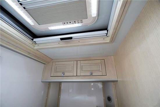 尾部收纳空间也非常丰富,对开式储物柜及吊柜内部分别可存放日常换洗衣服及被褥等床上用品。顶部多美达天窗采光及通风换气效果好。丰富的选装配置包括氮气前后减震、驾驶室哑光灰/黑/白/红色系、进口板材、电动升降餐桌、1100W升顶太阳能板、进口电动粉碎马桶、外部自吸式水功能。