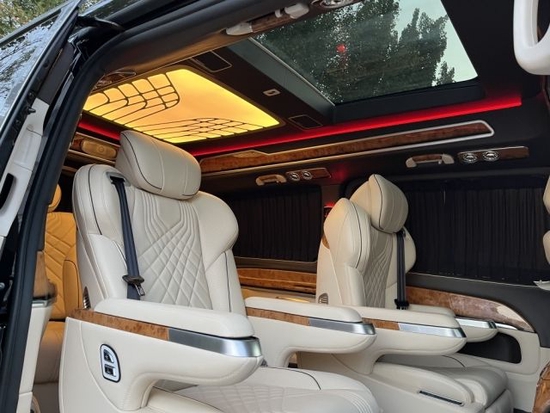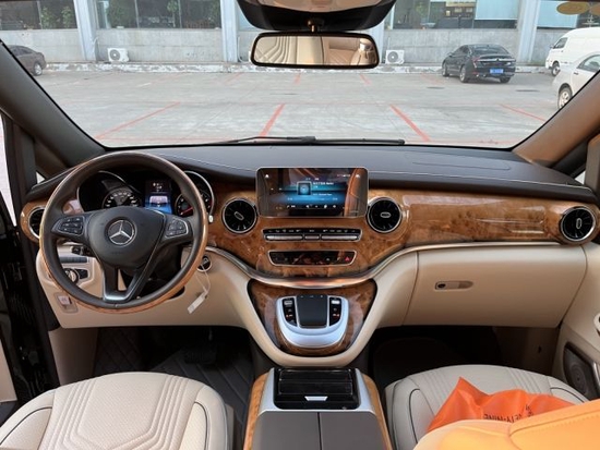 奔驰v260L内饰非常奢华,无论是中控台还是方向盘,都与奔驰轿车采取了相同的规划,进入车内,绝对能让你情不自禁的感叹道:这才是大奔!环顾座椅四周,真皮、实木、金属合理搭配,整体视觉效果相当不错,做工方面,V级车内饰自然也坚持了豪华品牌应有的高水准。奔驰V级 采用的三幅式方向盘是与C级 (配置|询价)同款样式,所以,不会给驾驶者带来开大车的压力。换挡拨片的加入,也算是一处惊喜。
