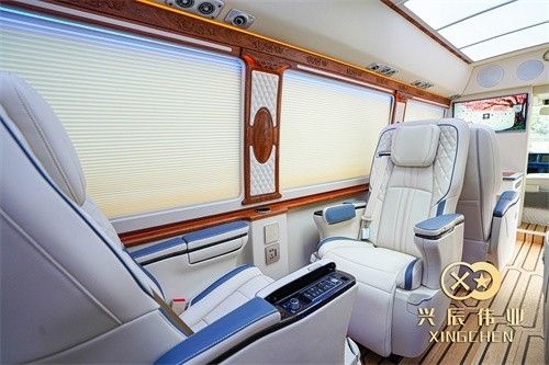 车内布局完全是以商务接待为主,座椅向后旋转180°后,安装上可拆卸的小桌板,立马变成一个移动的会客厅,在车内就可以进行商务洽谈、移动办公等。而且前后舱可以更具需要进行独立分开还是前后贯通的状态。