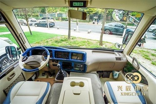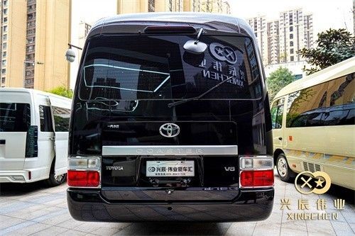 这台黑紫色外观的丰田考斯特;为什么叫做黑紫色呢?因为这款车的车身漆面在一般的天气下呈现出纯黑色的外观;一旦在阳光下面整个车身漆面就会变成紫色哦,非常的漂亮。而且紫色代表了神秘、高贵。