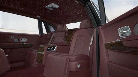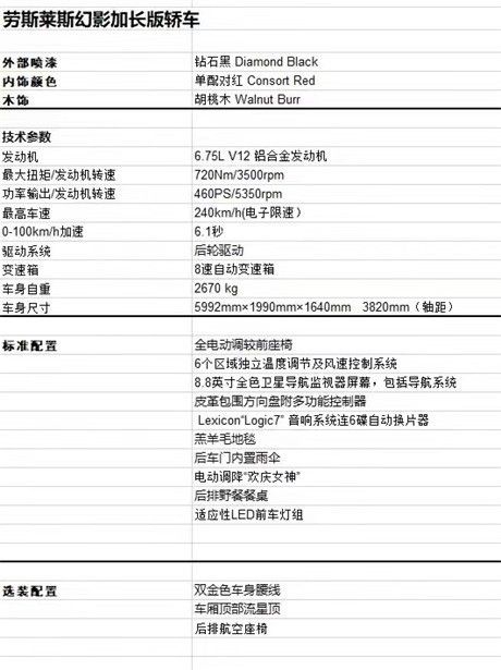 劳斯莱斯幻影加长版 钻石黑/红,选配:胡桃木,星空顶,双金色腰线,后航空座椅,前通风,窗帘