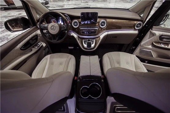 V250乘客舱前排首长级多功用按摩座椅带脚托,规划了滑轨,可自由电动移动和缩短,适应多种身高、体型的乘客,多种坐姿任君挑选,将舒适惬意延伸到车内每个旮旯。娱乐影音装备齐全,吸顶高清液晶电视,需求时可以往下翻,按钮一按,最新热点、时髦资讯随时把握。