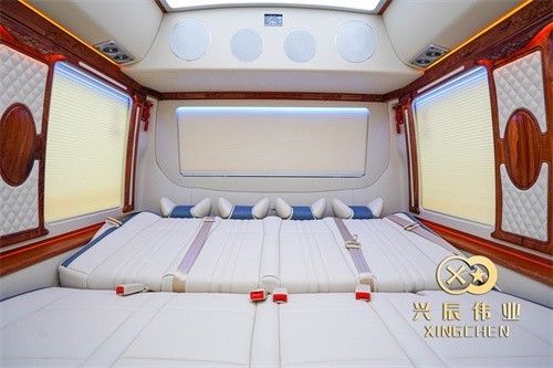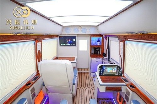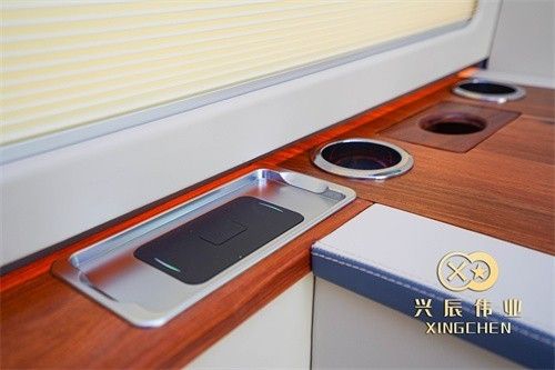 车内还有一个超宽屏的液晶电视,不仅可以播放电视,投放我们的文件,还可以有一个KTV的娱乐系统,不仅可以作为一个办公工具,还可以作为一个娱乐设施设备提供我们整车人享用。座位前方还有一个超大的办公桌,提供给我们整车任使用,不仅可以在我们的车内进行办公,如果说在娱乐的时候,我们也可以将我们的酒水、饮料、水果放在桌面