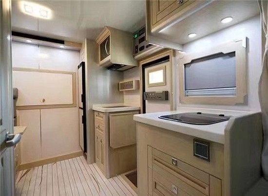 由乘客门隔开,不同的功能相互呼应的同时也让做饭井然有序,橱柜推拉式抽屉便于存放日常生活用品及碗具。其它方面配备触摸式集中控制系统+机械式翘板开关、液晶电视、小米盒子、日本YAMAHA八喇叭音响系统(带低音炮)、抽油烟机、微波炉、西门子电磁炉、152L赛特福德房车专用冰箱、大宇3kg洗衣机、特鲁马燃油暖风热水一体机、四路监控、一氧化碳/烟雾报警器等。室内多个220V、12V电源插座及USB充电接口可满足日常充电需求。