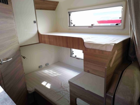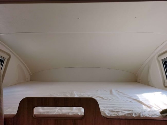 驾驶室上方额头双人床设计,配备隐私帘,可满足两名成年人休息,顶部两侧配有外推窗,保证了充足的采光及空气畅通。