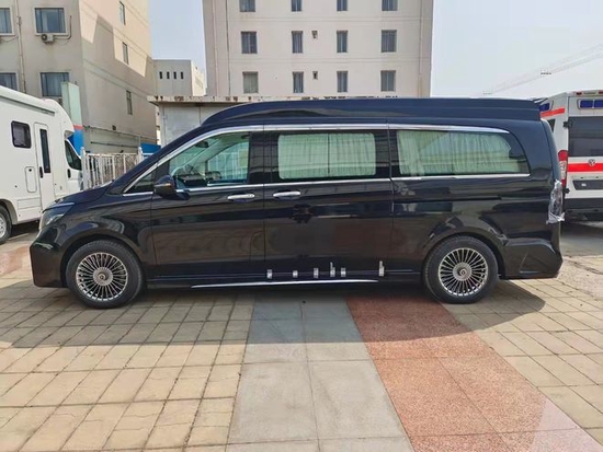 侧面的整体造型和原车对比差异还是很大,我们从上往下说,首先增加了车窗周边的镀铬饰条其次是下方的迎宾舱脚踏板,因为22款奔驰V级 商务车,全系增加了空气悬挂,所以底盘可根据驾驶模式及手动调节,车身姿态的高低。