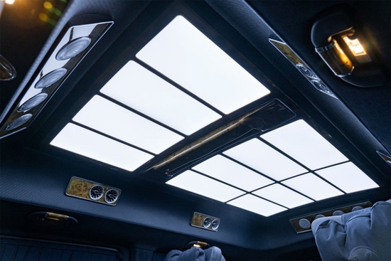 2022款奔驰圣姆峰MH7定制迈巴赫式水晶萤石九宫格顶灯,质感晶莹剔透,通过镶嵌式总控进行控制,多色可调式氛围灯,可让后舱根据需求转变成不同的场景,周边还有定制手感漆拉手及出风口。