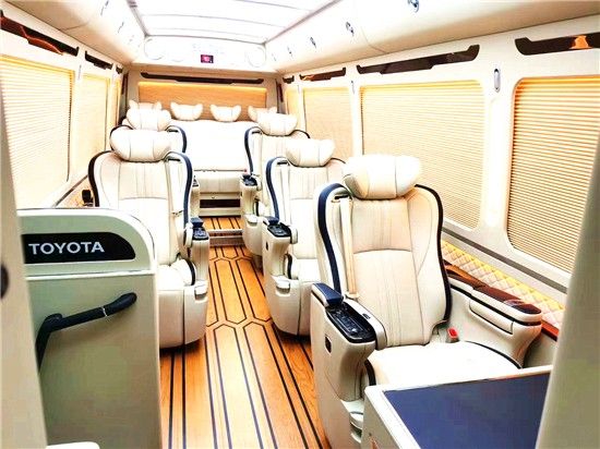 丰田考斯特内饰设计可满足客户的高品质需求,全车加装了航空座椅,首长席办公桌,高密度阻燃地毯,还搭载了全新顶灯,能给客户带来不同寻常的舒适体验。因此,无论是商务需求亦或是家庭旅行,创新概念改装商务车丰田考斯特,都能使的客户感到非常满意。