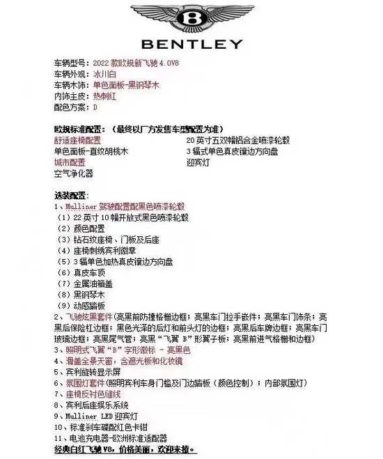 2022款宾利飞驰4.0T V8批量现车在售,顶级豪华轿车的甄选座驾,高端的品质,豪华舒适的乘坐环境,个性化的配置选择,以最具实惠的价格让您选购一辆心爱的座驾,天津港口最新行情优惠报价,全国上牌落户,全国三包联保,更多详细信息可致电咨询销售经理(联系方式见文底)
