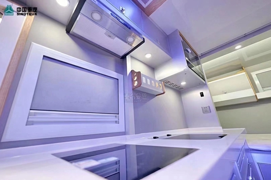 车内实木(美国红橡)搭配拉丝铝板家具+环保型房车专用柚木地板革;布局方面,采用了会客区对卡座沙发+气动升降餐桌+实木组合式橱柜+卫生间+车尾横置上下床的布局结构设计,全车的储物空间非常丰富,对于长期户外旅游者来说实用性高。暖色系氛围更贴近居家效果,让成员即使在外旅行也能感受到住家的感觉。会客区真皮软包对卡座沙发满足4人乘坐,卡座沙发搭配气动升降餐桌可变为一张沙发床;固定式安全带保护行车途中乘客的人身安全。坐垫厚实,弧形靠背也提供一定的支持感,整体来说乘坐舒适感还是不错的;沙发内侧墙壁2个独立外推窗,提供采光及通风换气效果;三菱重工变频空调(单冷)制冷效果快,可手动调节温度;吊柜方便日常收纳物品。