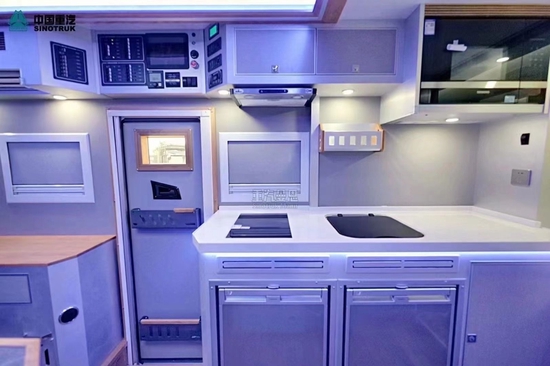 箱体采用六明治箱体复合材料,其开发的初衷为高安全性和高保温性,大量高科技材料的应用使6CM厚的箱体达到了红砖24墙的保温效果。高强度铝合金骨架经过热断桥处理,附重部分采用铝包木结构,使箱体工艺具有安全系数高,隔音隔热一流的特点,且在整车发生翻滚时起到保护坐乘人员的作用。重汽豪沃越野房车车窗采用越野房车专属车窗,配英国品牌遮阳帘和防蚊网。尾部20000T-MAX 24伏电动绞盘,备胎电动挂在系统,加挂两个外部储物盒。1600AH锂电,400升净水的超大水电系统是长期驻车的保障。自吸水功能可在水源处随意补水,美国红橡实木家具牢固可靠,液压尾架可提升2吨级重物(例如哈雷,宝马ADV等)。安全可靠,美观舒适是我们的设计原则。全国千家服务站是安全用车的保障。