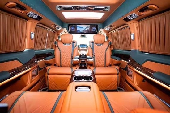 奔驰V250前后排隔断的处理方式,更好的为大家提供隐秘性并且大大提升了后排的娱乐体验。隔断采用的是32寸曲面屏电视后排的乘客可以通过隔断下方的中央操控面板控制的电视升降和车内灯光的调节。