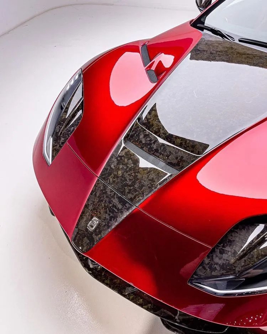 车头变化尤为明显,诸如:引擎盖T形饰板、前唇、前保险杠、出风口格栅等区域均采用48K-BR锻造碳打磨而成的空气套件做了无损式嵌入升级。在材料界素有“黑色黄金” 之称的碳纤维集:轻量、坚固、耐腐蚀、抗拉伸、耐高温等诸多优良属性为一体,用其打造的宽体包围不仅能够提升前脸视觉效果和霸气指数,宽体件形成的“真空区”还可增强车头下压力,令812 Stallone在疾跑、转弯过程中更趋于平顺稳定。