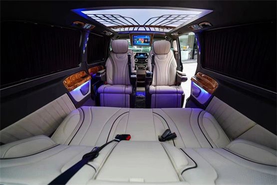 奔驰V260L隐藏六座系列后排座椅为总裁沙发座椅(根据人体工程学设计)一键式展开一键收回(记忆功能)自动找到最舒适的角度,舒适度和随意性更强,双侧壁设计集成丰富配置,多媒体触摸屏、商务桌板、多媒体接口、压缩机车载冰箱等办公、娱乐设备给您带来充足乘坐享受,精湛工艺可靠品质树立威霆商务房车新典范。
